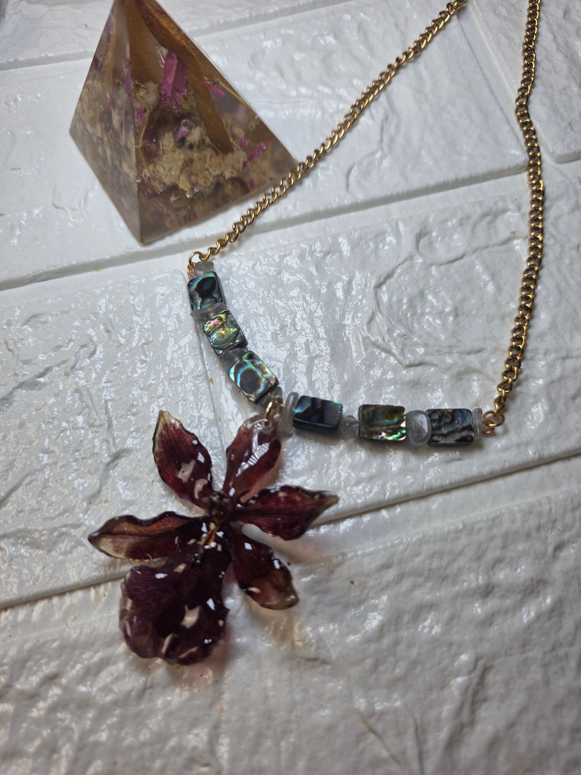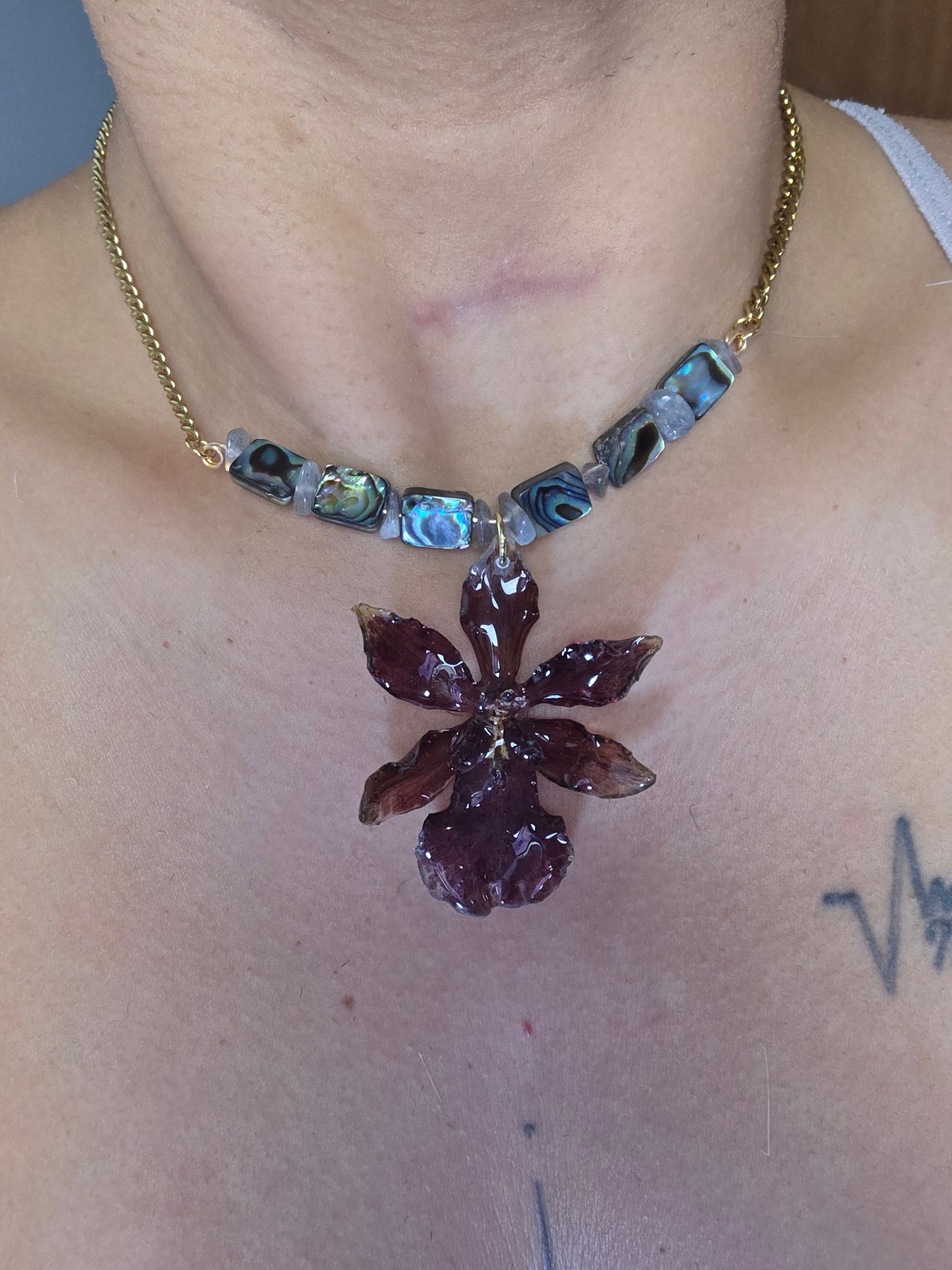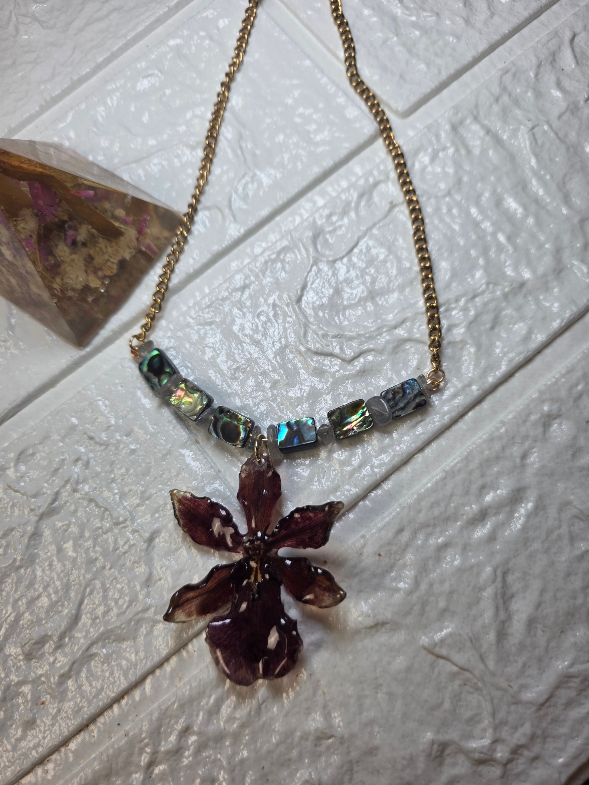 Este collar presenta una orquídea natural preservada en resina, acompañada de cuentas de abalone que reflejan la luz con destellos únicos. Cada elemento ha sido seleccionado y ensamblado a mano, respetando la belleza orgánica de la flor.