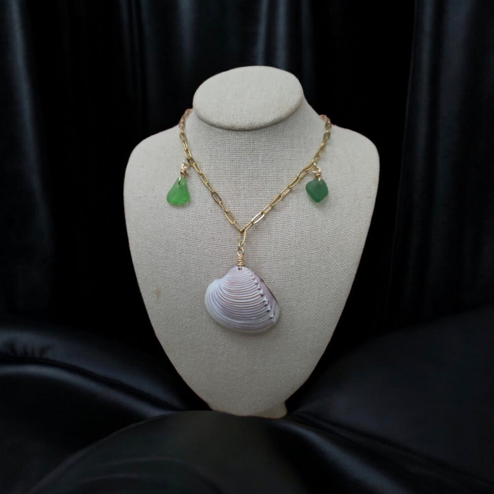La concha y el cristal marino (sea glass) fueron transformados por el océano y rescatados para convertirse en una joya artesanal única. 🌊💚